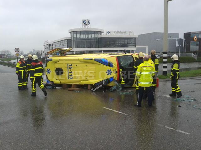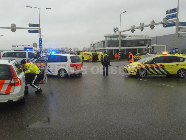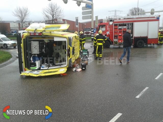 Wateringen – Op de kruising van de Wippolderlaan met de Wateringseveldweg is woensdagmiddag een ambulance gekanteld na aanrijding. De ambulance reed zonder spoed naar het ziekenhuis om een patiënt af te leveren toen deze werd geschept door een personenauto.