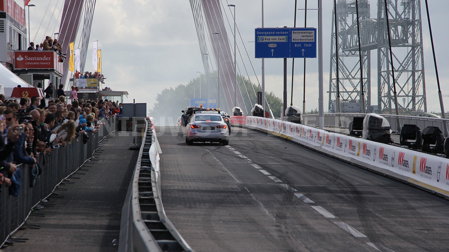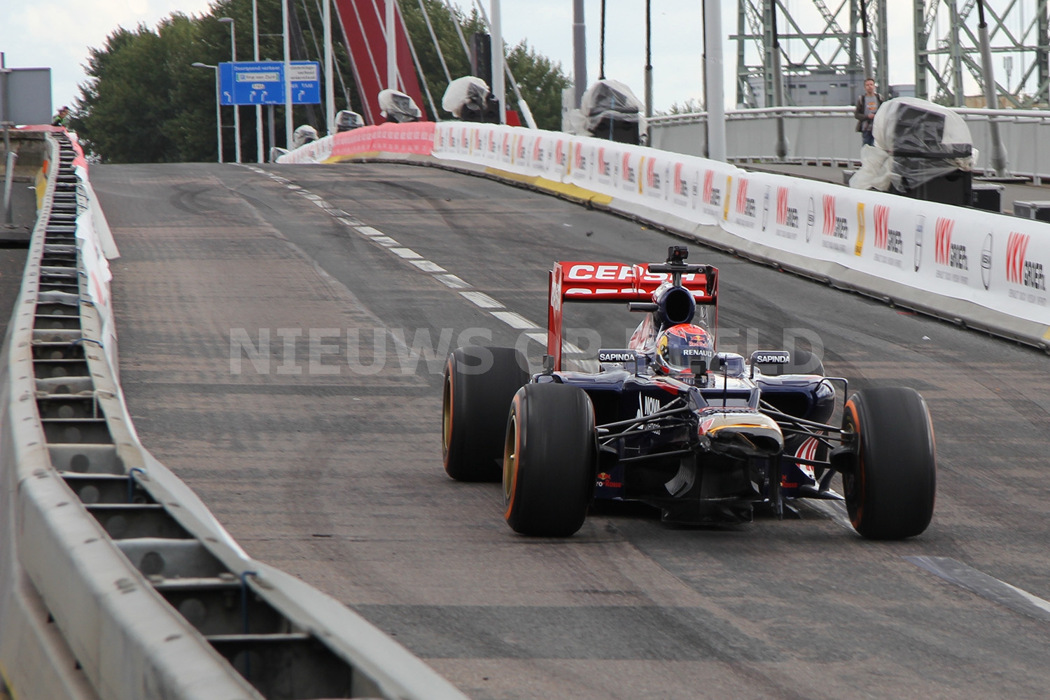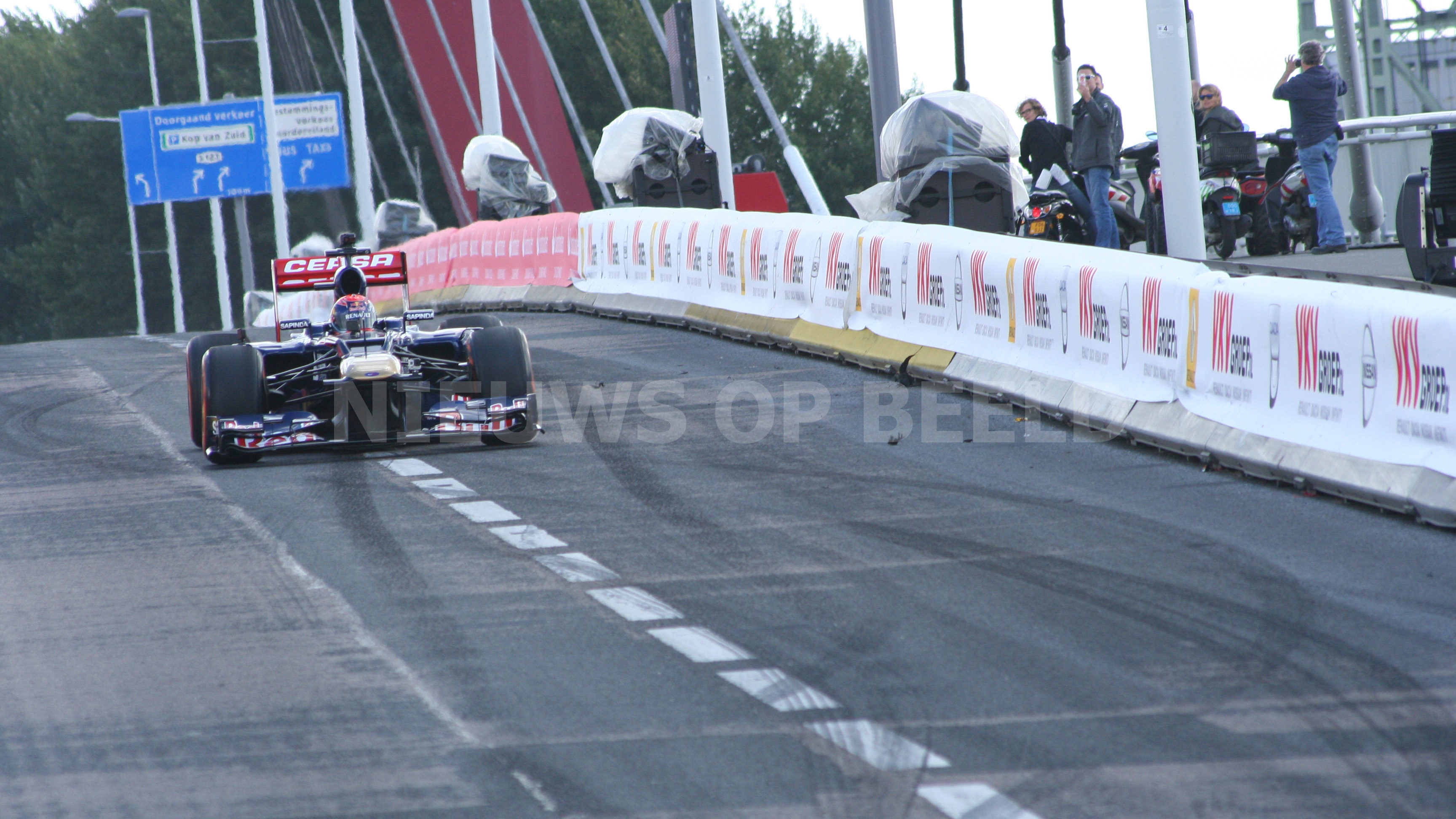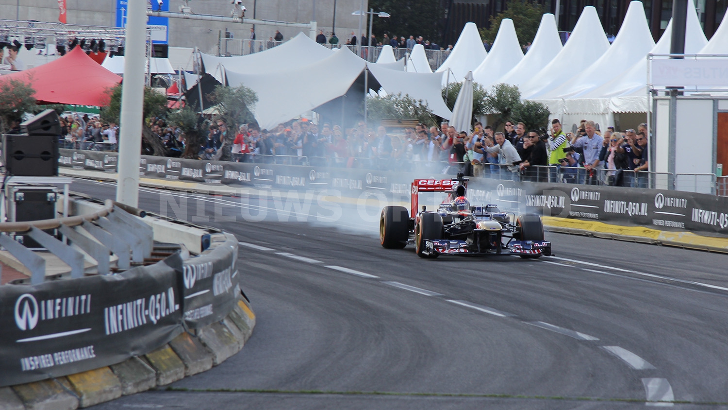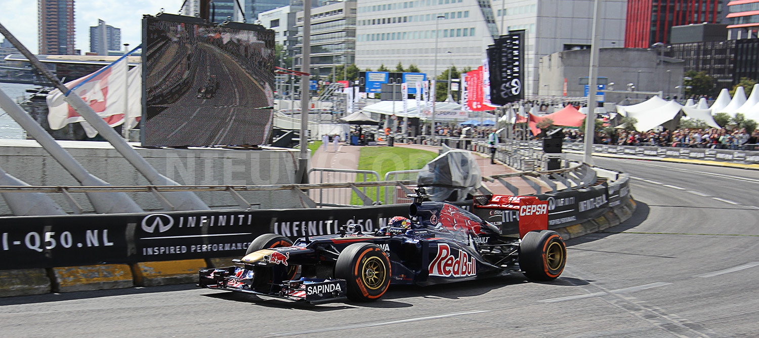 Max Verstappen scheurde met zijn Formule 1 wagen door de straten van Rotterdam. Bij het driften op het Hofplein ging het echter fout. Nadat hij was losgeduwd wilde hij naar voren rijden en raakte daarbij de betonnen vangrail. De neus van de Formule 1 wagen brak af en er restte niets anders dan nog op volle snelheid een mooi publieksrondje te rijden.