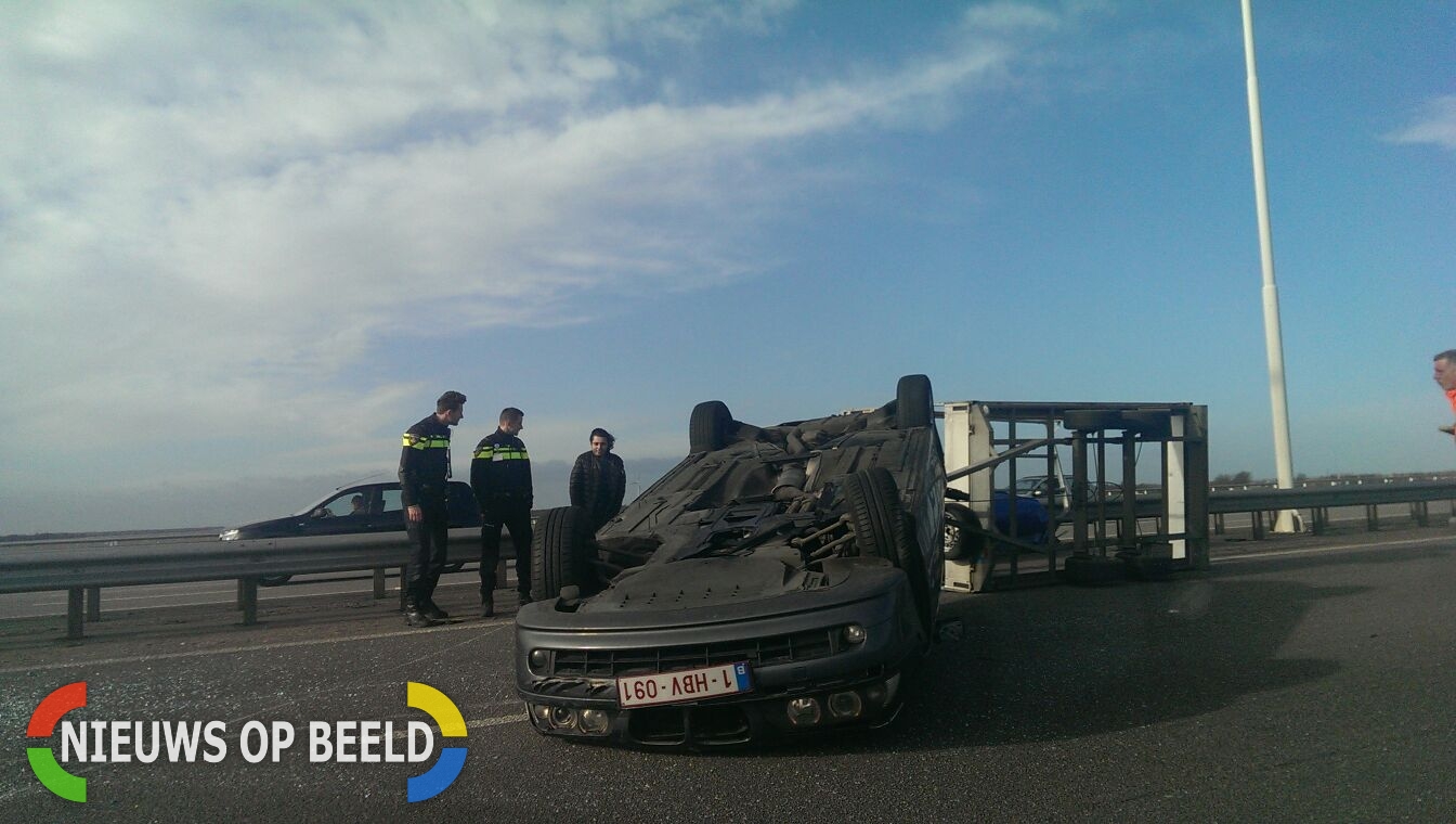 Dordrecht – Een Belgische automobilist is maandagmorgen met zijn auto en aanhanger over de kop geslagen na een flinke windvlaag. Op de A16 Moerdijkbrug was er mogelijk sprake van een windstoot waarna de aanhanger omver werd geblazen. De auto werd vervolgens eveneens omgetrokken.