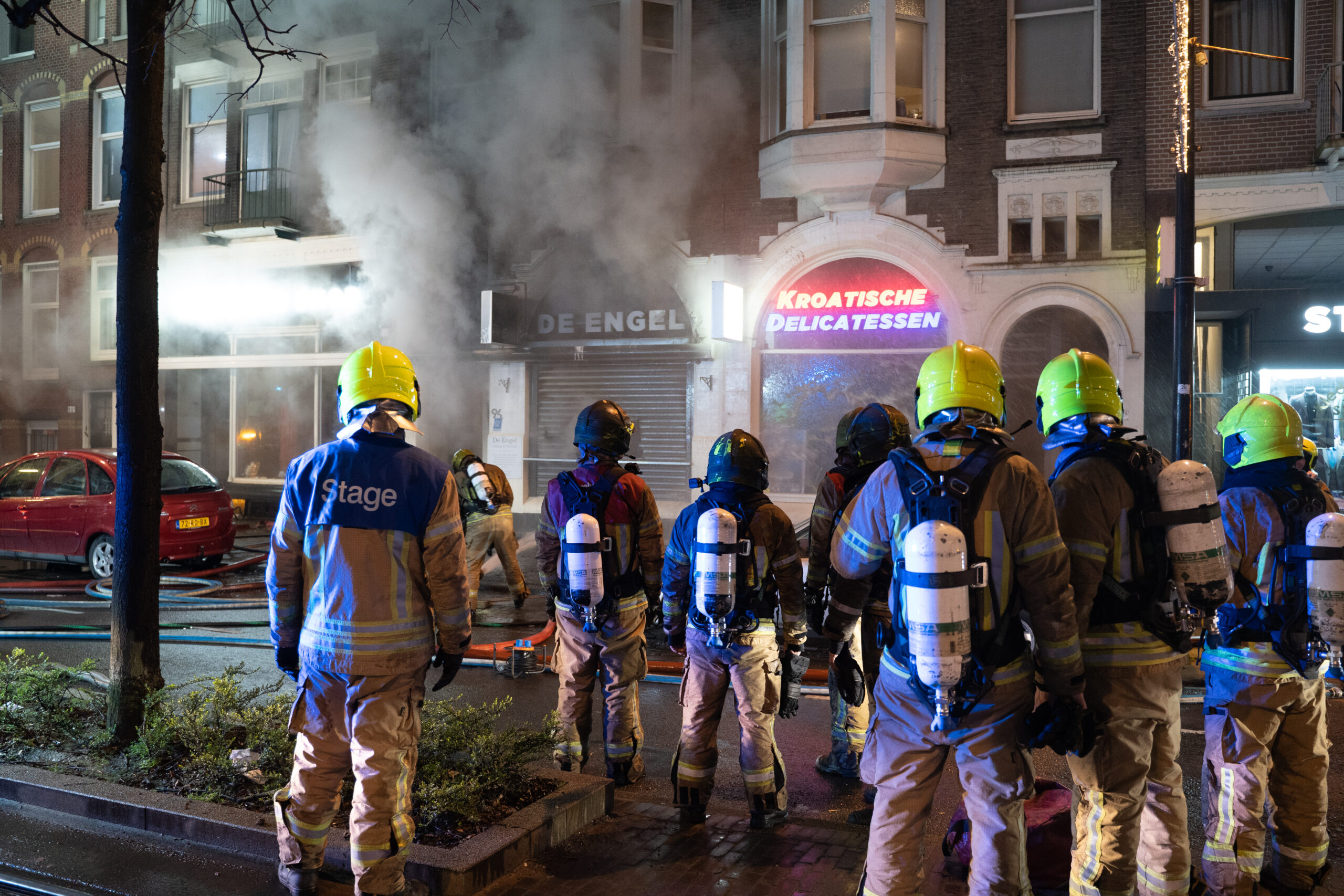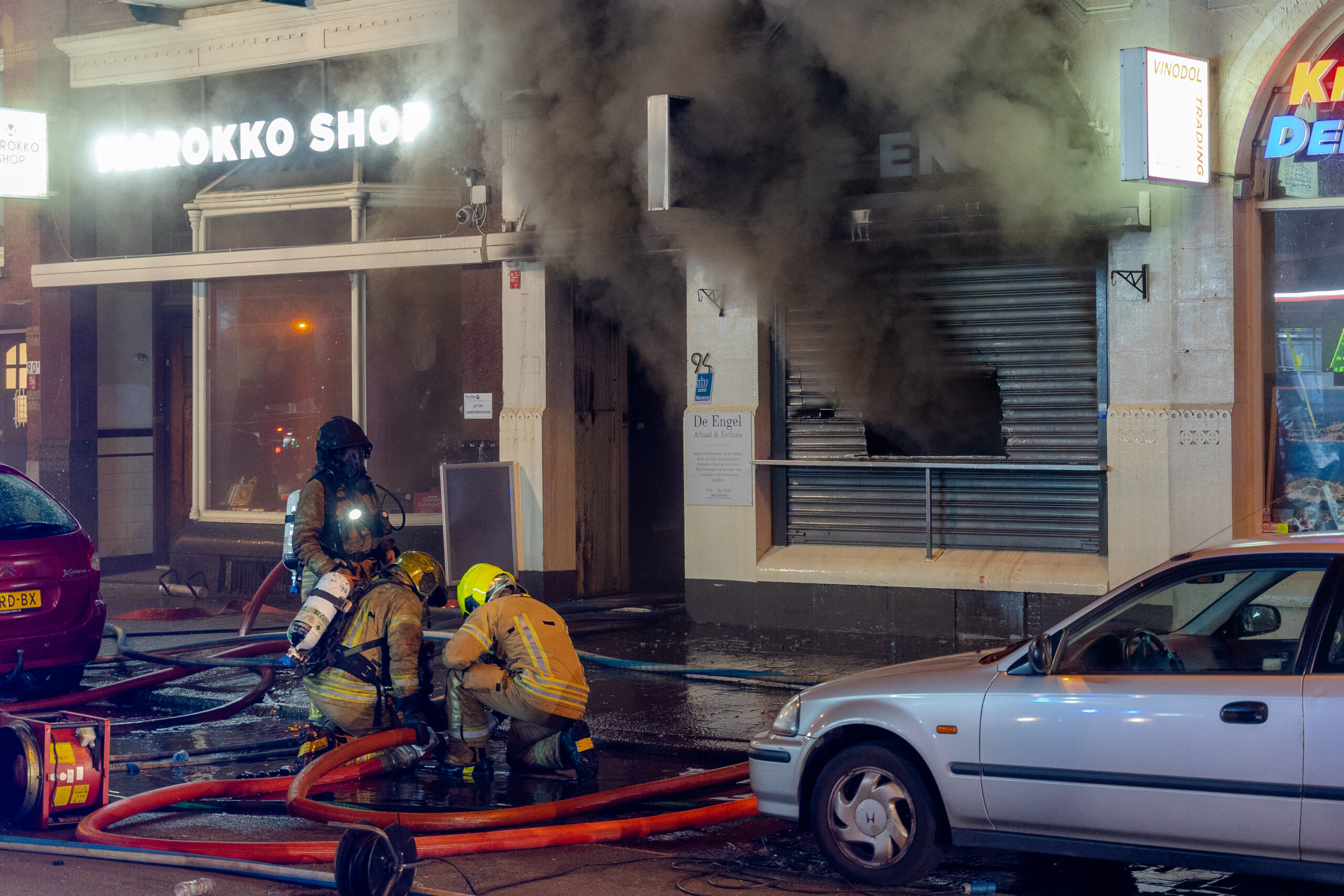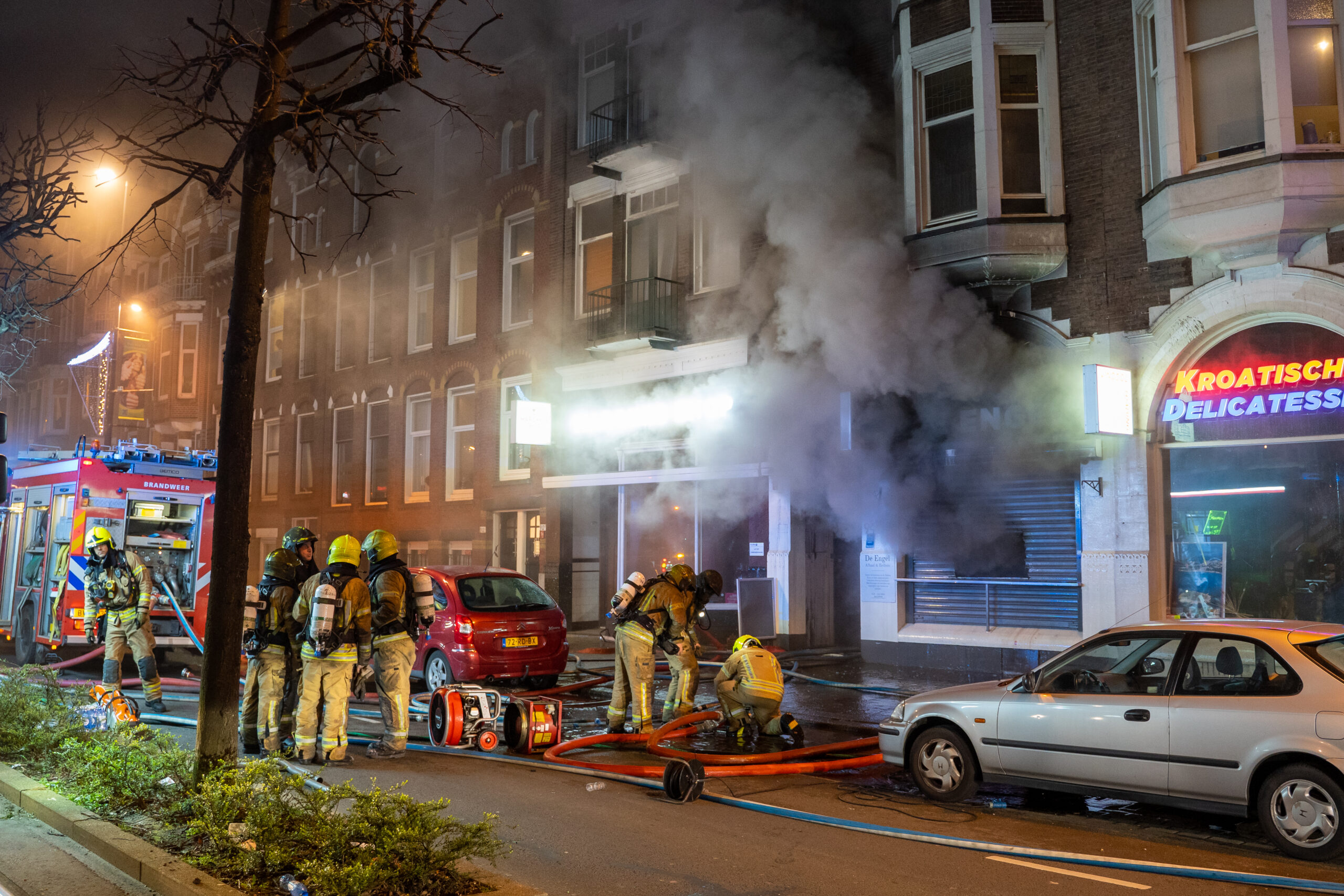ROTTERDAM – Een felle brand in horecazaak De Engel heeft zondagavond meerdere winkels en woningen verwoest. De brand brak omstreeks 20.30 uur uit en greep snel om zich heen. De brandweer was snel ter plaatse en probeerde de brand nog van binnenuit te blussen. Het vuur was echter zo heet dat besloten werd om terug te trekken en de brand van buitenaf te blussen.