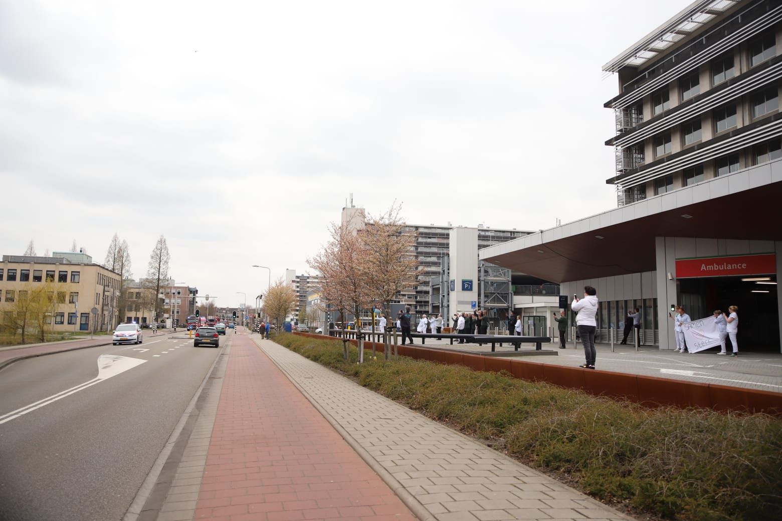 Hulpverleners van de brandweer, politie en ander zorgpersoneel verzamelden zich voor het ziekenhuis met hun dienstwagens. Door middel van sirenes en luid applaus staken ze het zorgpersoneel een hart onder de riem.