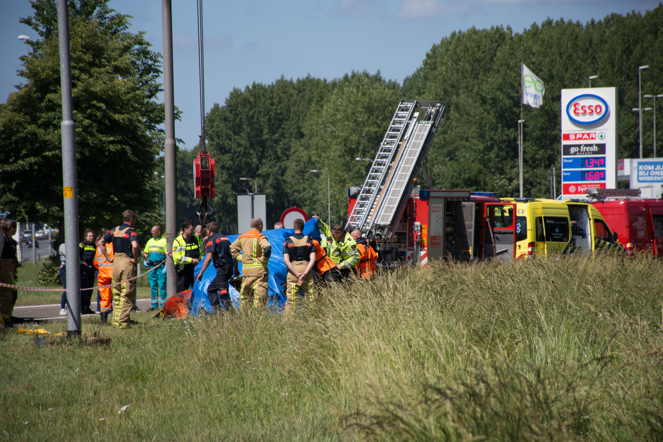 Rond 11.00 uur werden hulpdiensten massaal gealarmeerd, nadat het voertuig langs de oprit naar een tankstation in de sloot werd gevonden. Het vermoeden bestaat dat het voertuig er al langer in heeft gelegen.