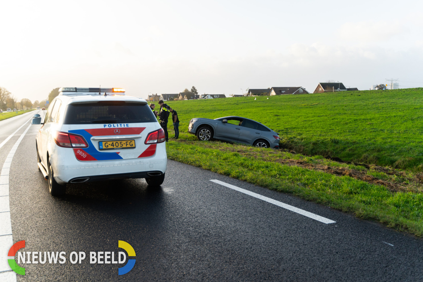 Een bergingsbedrijf is ter plaatse gekomen om de auto weer uit de greppel te halen. De schade aan de auto lijkt op het eerste gezicht mee te vallen.
