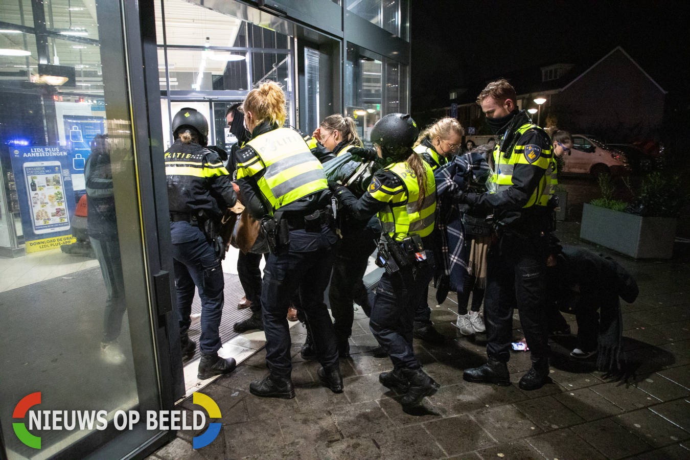 Agenten in Delft moeten met een slachtoffer toevlucht zoeken in een supermarkt, omdat zij buiten bekogeld worden met vuurwerk (Fotografie: Sebastiaan Barel)