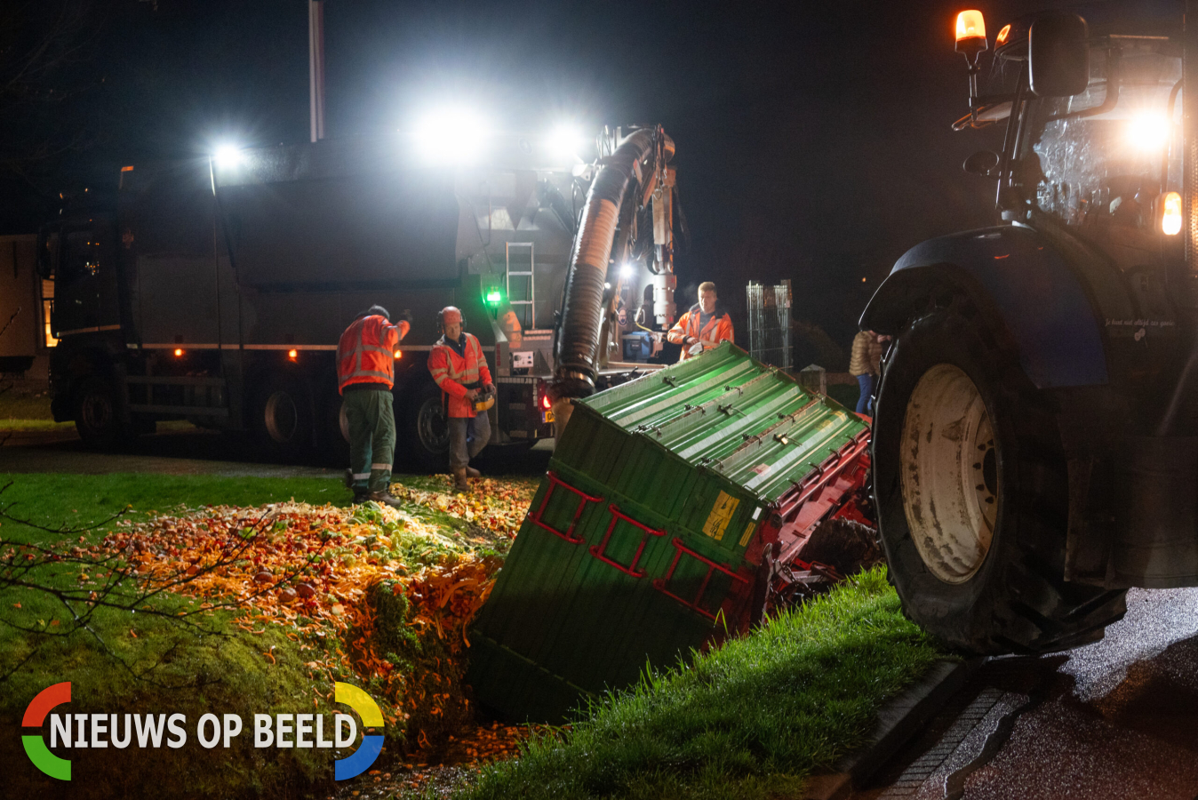 De boeren ter plaatse zorgden met hun netwerk ervoor dat ze zelf de trailer konden bergen. Zo kwam er een grondzuiger ter plaatse om de lading weg te zuigen en een graafmachine om de trailer uit de sloot te trekken. Vervolgens kon de berm en sloot, welke bezaaid waren met snijafval, worden schoongemaakt. Nadat er een nieuw bandje onder de trailer was gezet kon deze worden weggereden.