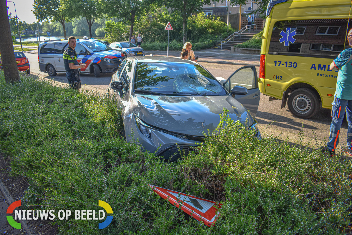 Een berger heeft de zwaarbeschadigde auto afgesleept, het andere voertuig dat beschadigd is geraakt zal later worden opgehaald. Gemeente Nissewaard gaat zo snel mogelijk de borden herstellen.