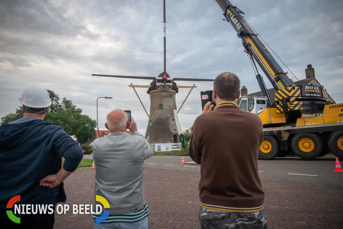 Abbenbroek – Vanmorgen zijn de roeders, een onderdeel van de wieken, van molen De Hoop uitgehesen voor groot onderhoud. De operatie startte vanmorgen om 07:30 uur. Ondanks de vroege tijd trok het toch een redelijk publiek die met interesse toekeek.