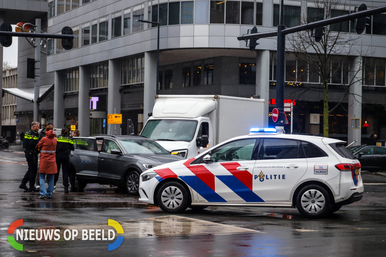 Op de kruising van de Delftse Poort en de Weena in Rotterdam zijn maandagmiddag twee automobilisten hard met elkaar in botsing gekomen. Een bestelbus en een personenauto raakte beide zwaarbeschadigd.