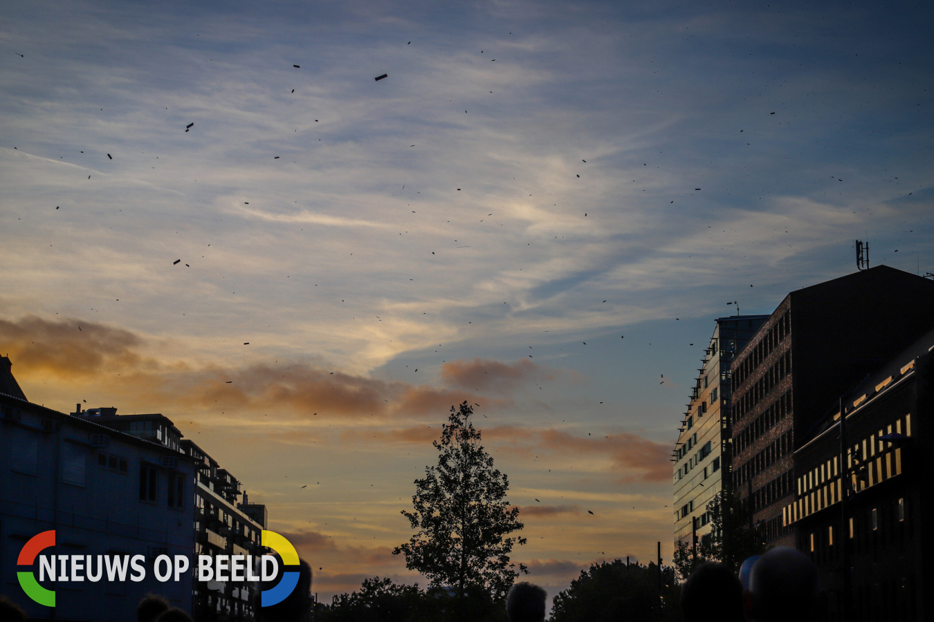 Boven de Binnenrotte in Rotterdam zijn woensdagavond 106.000 boekenleggers met gedichten uit een helikopter gedropt ter herdenking van het bombardement op Rotterdam, vandaag precies 85 jaar geleden.