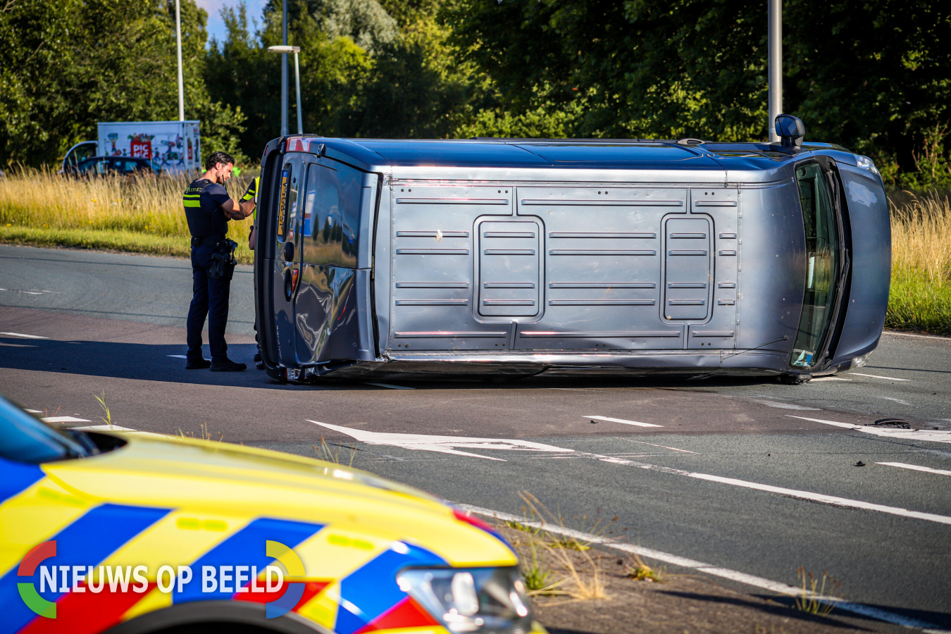 Op het Groene Kruisplein in Rhoon zijn zaterdagavond een busje en een personenauto met elkaar in botsing gekomen. Het busje is na de botsing gekanteld en enkele meters doorgeschoven.